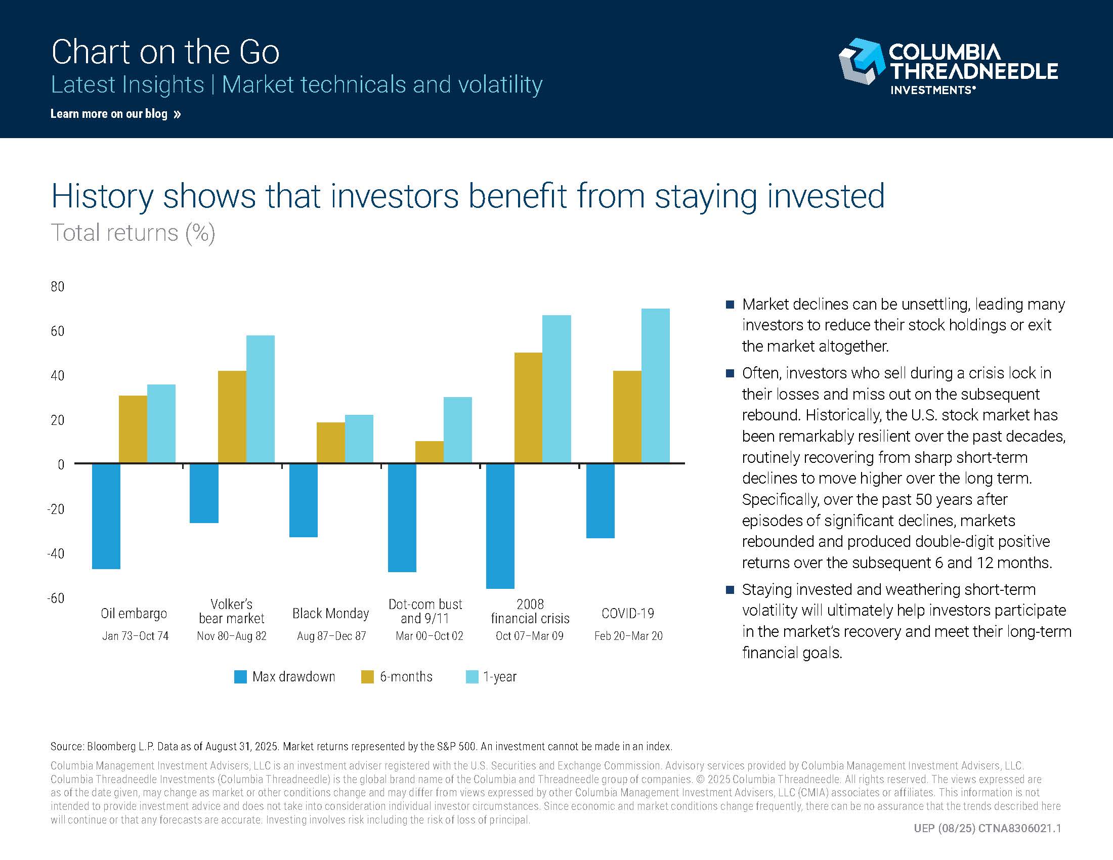 Looking back over the past 50 years, history tells a powerful story: even in the face of oil embargoes, recessions, financial crises, and a global pandemic, the market has demonstrated remarkable resilience. The chart below illustrates just that. After periods of steep decline, the S&P 500 consistently rebounded—often producing strong double-digit returns just 6 to 12 months later.